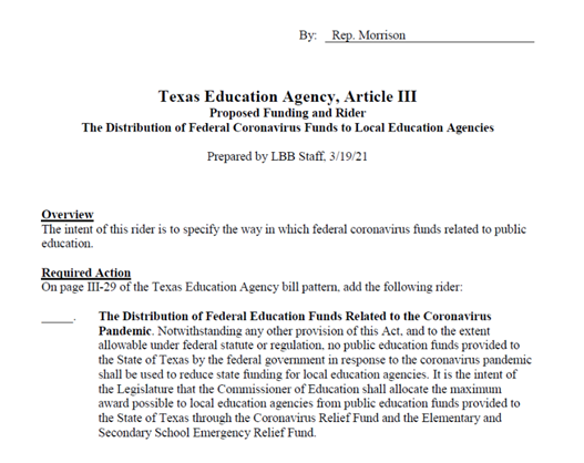 To address this Rep. Geanie Morrison (R-Victoria) filed an Appropriations rider that reinforces federal restrictions on federal stimulus dollars and disallows them to be used to supplant the state budget.