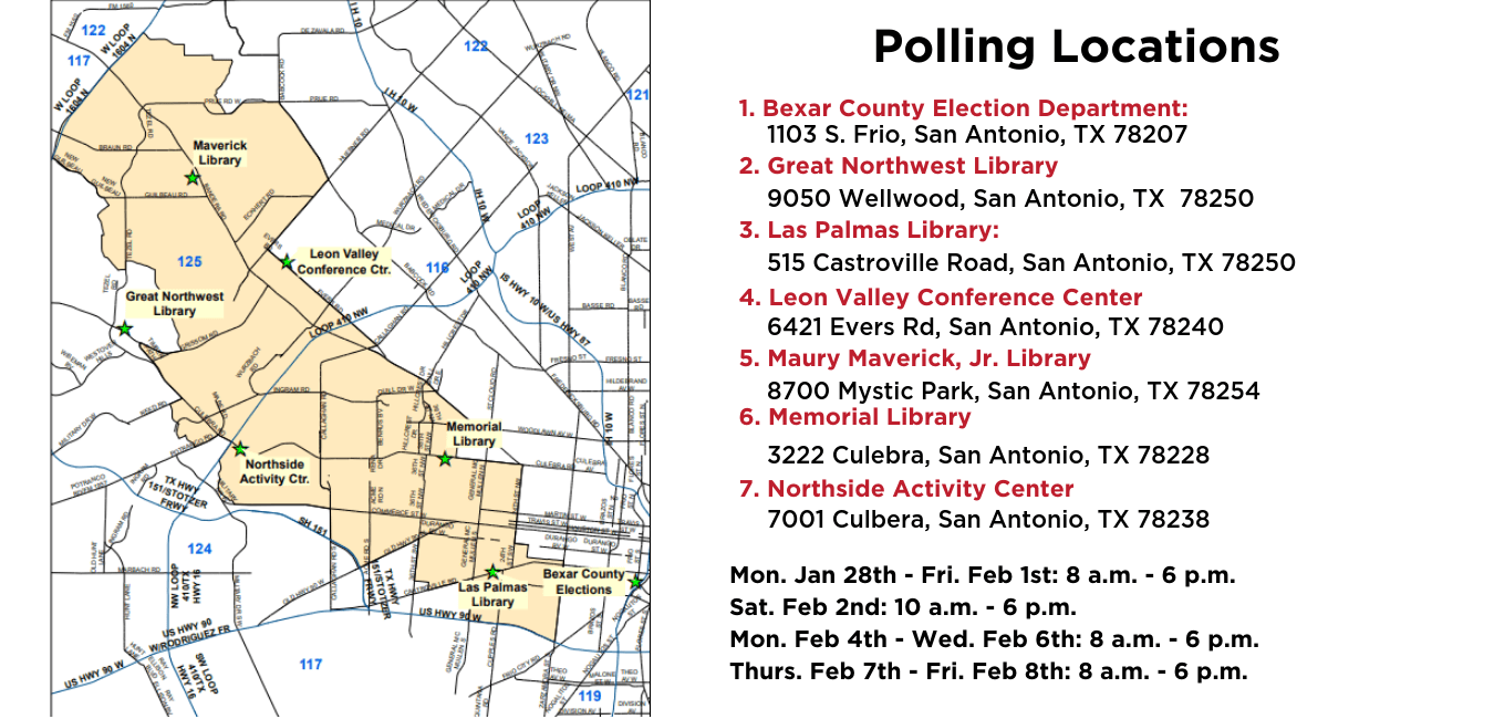 The first day of early voting in the Texas House District 125 special election begins today. The vacancy for the seat was created when the previous State Representative, Justin Rodriguez (D-San Antonio), resigned. Rodriguez was appointed as Bexar County Commissioner to fill a vacancy after the previous commissioner, Paul Elizondo, recently died.