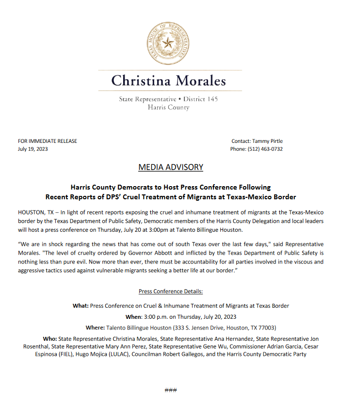 Top 5 This Week Texas Supreme Court Primary Shakeup Ends Before It Begins: Two Justices Now Unopposed Elections RA Staff - December 26, 2025 Texas Billionaire Brockman’s Estate Pays $750 Million to Settle Historic Tax Case Lifestyle RA Staff - December 26, 2025 How Are Texas High School Basketball Championships Decided? High School Basketball RA Staff - December 26, 2025 Texas Camps Install Flood Sirens After Deadly Camp Mystic Flood Public Safety RA Staff - December 25, 2025 Christmas Day 2025: What’s Open, What’s Closed, and Where You Can Still Go Lifestyle RA Staff - December 25, 2025 Related Posts Continue to the category JD Vance Takes Aim at Jasmine Crockett’s Senate Bid Politics Susie Wiles Offers Rare Look Inside Trump’s White House Politics Ken Paxton’s Divorce Files Could Soon Be Public Politics Houston City College Elects Renee Jefferson Patterson to District II Trustee Role Politics Houston Voters Choose New Leadership: Alejandra Salinas Wins At-Large Council Seat Politics Major Donors Walk Out as Alamo Leadership Clash Deepens Politics Harris County Democrats To Host Press Conference Following Recent Reports Of DPS’ Cruel Treatment Of Migrants At Texas-Mexico Border Politics Author: Press Release July 20, 2023 Less than 1 min.read FacebookTwitterEmail Download the full press release Previous articleTexas’ Wake-Up Call? Four Cities Ranked Among Nation’s Least EducatedNext articleInfant Mortality Spikes After Texas Abortion Ban Press Release LEAVE A REPLY Cancel reply Comment: Please enter your comment! Name:* Please enter your name here Email:* You have entered an incorrect email address! Please enter your email address here Website: Save my name, email, and website in this browser for the next time I comment. Δ