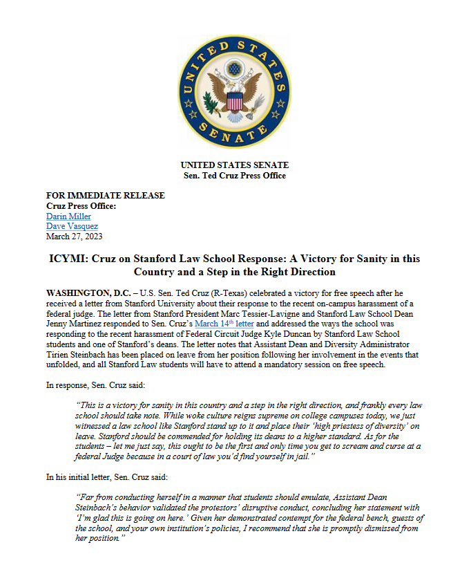 Top 5 This Week Texas Supreme Court Primary Shakeup Ends Before It Begins: Two Justices Now Unopposed Elections RA Staff - December 26, 2025 Texas Billionaire Brockman’s Estate Pays $750 Million to Settle Historic Tax Case Lifestyle RA Staff - December 26, 2025 How Are Texas High School Basketball Championships Decided? High School Basketball RA Staff - December 26, 2025 Texas Camps Install Flood Sirens After Deadly Camp Mystic Flood Public Safety RA Staff - December 25, 2025 Christmas Day 2025: What’s Open, What’s Closed, and Where You Can Still Go Lifestyle RA Staff - December 25, 2025 Related Posts Continue to the category JD Vance Takes Aim at Jasmine Crockett’s Senate Bid Politics Susie Wiles Offers Rare Look Inside Trump’s White House Politics Ken Paxton’s Divorce Files Could Soon Be Public Politics Houston City College Elects Renee Jefferson Patterson to District II Trustee Role Politics Houston Voters Choose New Leadership: Alejandra Salinas Wins At-Large Council Seat Politics Major Donors Walk Out as Alamo Leadership Clash Deepens Politics ICYMI: Cruz On Stanford Law School Response: A Victory For Sanity In This Country And A Step In The Right Direction Politics Author: Press Release March 27, 2023 Less than 1 min.read FacebookTwitterEmail Download the full press release Previous articleTrump Kicks Off 2024 Campaign, Attacks DeSantis And GOP Foes At Texas RallyNext articleState Representative Carl Sherman’s Press Conference Announcing “Body Cameras For All” Bill Press Release LEAVE A REPLY Cancel reply Comment: Please enter your comment! Name:* Please enter your name here Email:* You have entered an incorrect email address! Please enter your email address here Website: Save my name, email, and website in this browser for the next time I comment. Δ