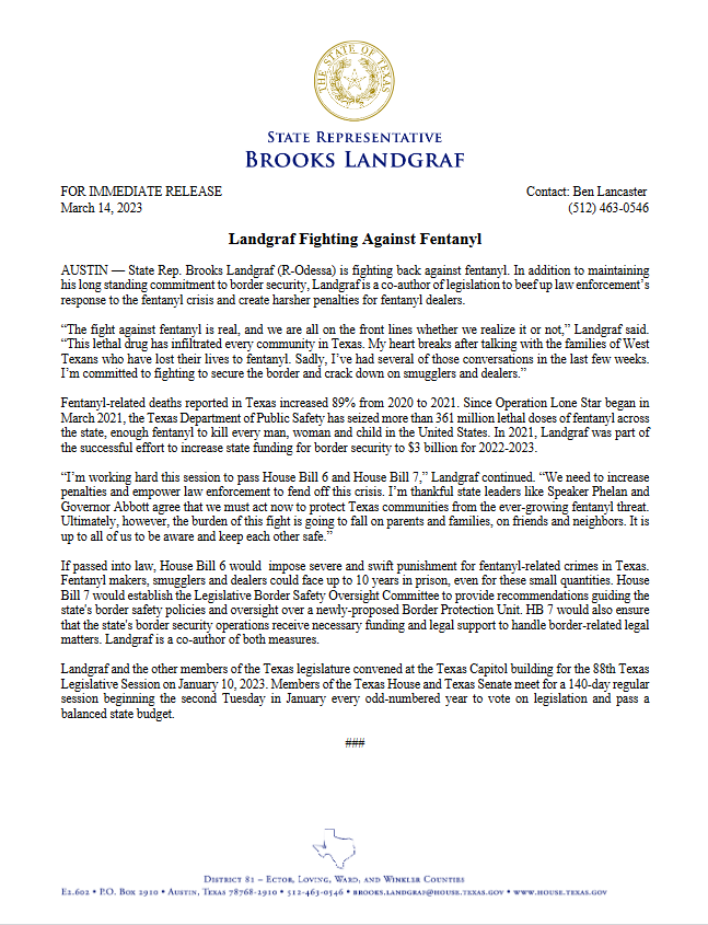 Top 5 This Week Texas Supreme Court Primary Shakeup Ends Before It Begins: Two Justices Now Unopposed Elections RA Staff - December 26, 2025 Texas Billionaire Brockman’s Estate Pays $750 Million to Settle Historic Tax Case Lifestyle RA Staff - December 26, 2025 How Are Texas High School Basketball Championships Decided? High School Basketball RA Staff - December 26, 2025 Texas Camps Install Flood Sirens After Deadly Camp Mystic Flood Public Safety RA Staff - December 25, 2025 Christmas Day 2025: What’s Open, What’s Closed, and Where You Can Still Go Lifestyle RA Staff - December 25, 2025 Related Posts Continue to the category JD Vance Takes Aim at Jasmine Crockett’s Senate Bid Politics Susie Wiles Offers Rare Look Inside Trump’s White House Politics Ken Paxton’s Divorce Files Could Soon Be Public Politics Houston City College Elects Renee Jefferson Patterson to District II Trustee Role Politics Houston Voters Choose New Leadership: Alejandra Salinas Wins At-Large Council Seat Politics Major Donors Walk Out as Alamo Leadership Clash Deepens Politics Landgraf Fighting Against Fentanyl Politics Author: Press Release March 14, 2023 Less than 1 min.read FacebookTwitterEmail Download The Full Press Release Previous articleNew School Choice Bill: Promising On Paper, Disaster In Practice?Next articleDoubling Down — State Senators Bet Against Green Energy In New Grid Bills Press Release LEAVE A REPLY Cancel reply Comment: Please enter your comment! Name:* Please enter your name here Email:* You have entered an incorrect email address! Please enter your email address here Website: Save my name, email, and website in this browser for the next time I comment. Δ