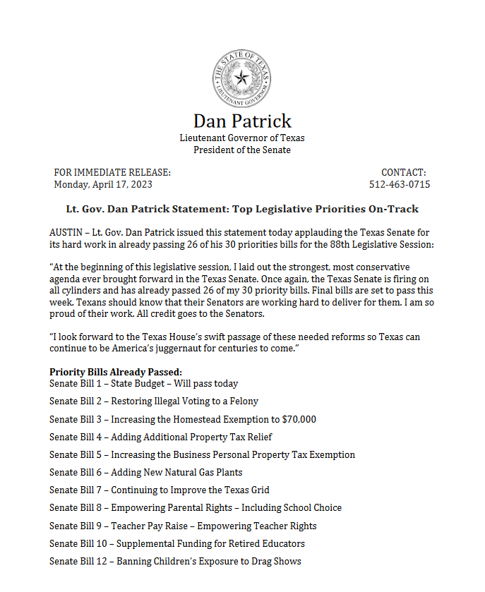 Top 5 This Week Texas Supreme Court Primary Shakeup Ends Before It Begins: Two Justices Now Unopposed Elections RA Staff - December 26, 2025 Texas Billionaire Brockman’s Estate Pays $750 Million to Settle Historic Tax Case Lifestyle RA Staff - December 26, 2025 How Are Texas High School Basketball Championships Decided? High School Basketball RA Staff - December 26, 2025 Texas Camps Install Flood Sirens After Deadly Camp Mystic Flood Public Safety RA Staff - December 25, 2025 Christmas Day 2025: What’s Open, What’s Closed, and Where You Can Still Go Lifestyle RA Staff - December 25, 2025 Related Posts Continue to the category JD Vance Takes Aim at Jasmine Crockett’s Senate Bid Politics Susie Wiles Offers Rare Look Inside Trump’s White House Politics Ken Paxton’s Divorce Files Could Soon Be Public Politics Houston City College Elects Renee Jefferson Patterson to District II Trustee Role Politics Houston Voters Choose New Leadership: Alejandra Salinas Wins At-Large Council Seat Politics Major Donors Walk Out as Alamo Leadership Clash Deepens Politics Lt. Gov. Dan Patrick Statement: Top Legislative Priorities On-Track Politics Author: Press Release April 17, 2023 Less than 1 min.read FacebookTwitterEmail Download the full press release Previous articleFriday Night LightsNext articleSpeaker Phelan Statement On Texas House Overwhelmingly Passing House Bill 2 To Create Largest Property Tax Cut In State History Press Release LEAVE A REPLY Cancel reply Comment: Please enter your comment! Name:* Please enter your name here Email:* You have entered an incorrect email address! Please enter your email address here Website: Save my name, email, and website in this browser for the next time I comment. Δ