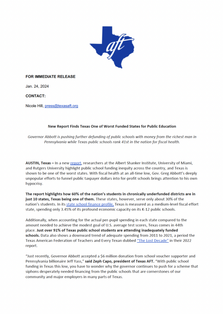 Top 5 This Week Texas Billionaire Brockman’s Estate Pays $750 Million to Settle Historic Tax Case Lifestyle RA Staff - December 26, 2025 How Are Texas High School Basketball Championships Decided? High School Basketball RA Staff - December 26, 2025 Texas Camps Install Flood Sirens After Deadly Camp Mystic Flood Public Safety RA Staff - December 25, 2025 Christmas Day 2025: What’s Open, What’s Closed, and Where You Can Still Go Lifestyle RA Staff - December 25, 2025 Texas Energy Costs Surge: Families Face Tough Decisions This Holiday Season Human Right's RA Staff - December 24, 2025 Related Posts Continue to the category JD Vance Takes Aim at Jasmine Crockett’s Senate Bid Politics Susie Wiles Offers Rare Look Inside Trump’s White House Politics Ken Paxton’s Divorce Files Could Soon Be Public Politics Houston City College Elects Renee Jefferson Patterson to District II Trustee Role Politics Houston Voters Choose New Leadership: Alejandra Salinas Wins At-Large Council Seat Politics Major Donors Walk Out as Alamo Leadership Clash Deepens Politics New Report Finds Texas One of Worst Funded States for Public Education Politics Author: Press Release January 24, 2024 Less than 1 min.read FacebookTwitterEmail Download the full press release Previous articleLaPoynor School District Flies Christian Flag, Sparking Constitutional DebateNext articleTexas Ranks 41st In Public Education Funding As Abbott Fights For Vouchers Press Release LEAVE A REPLY Cancel reply Comment: Please enter your comment! Name:* Please enter your name here Email:* You have entered an incorrect email address! Please enter your email address here Website: Save my name, email, and website in this browser for the next time I comment. Δ