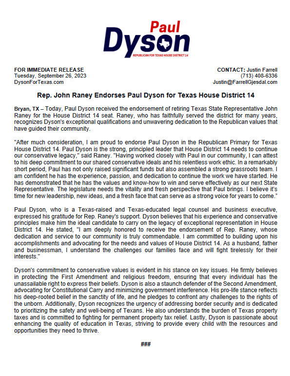 Top 5 This Week Texas Billionaire Brockman’s Estate Pays $750 Million to Settle Historic Tax Case Lifestyle RA Staff - December 26, 2025 How Are Texas High School Basketball Championships Decided? High School Basketball RA Staff - December 26, 2025 Texas Camps Install Flood Sirens After Deadly Camp Mystic Flood Public Safety RA Staff - December 25, 2025 Christmas Day 2025: What’s Open, What’s Closed, and Where You Can Still Go Lifestyle RA Staff - December 25, 2025 Texas Energy Costs Surge: Families Face Tough Decisions This Holiday Season Human Right's RA Staff - December 24, 2025 Related Posts Continue to the category JD Vance Takes Aim at Jasmine Crockett’s Senate Bid Politics Susie Wiles Offers Rare Look Inside Trump’s White House Politics Ken Paxton’s Divorce Files Could Soon Be Public Politics Houston City College Elects Renee Jefferson Patterson to District II Trustee Role Politics Houston Voters Choose New Leadership: Alejandra Salinas Wins At-Large Council Seat Politics Major Donors Walk Out as Alamo Leadership Clash Deepens Politics Rep. John Raney Endorses Paul Dyson For Texas House District 14 Politics Author: Press Release September 26, 2023 Less than 1 min.read FacebookTwitterEmail Download the full press release Previous articlePaxton Whistleblowers Announce They Will Continue Legal FightNext articleAll Navy Veterans Should Be Aware Of Asbestos Exposure Press Release LEAVE A REPLY Cancel reply Comment: Please enter your comment! Name:* Please enter your name here Email:* You have entered an incorrect email address! Please enter your email address here Website: Save my name, email, and website in this browser for the next time I comment. Δ