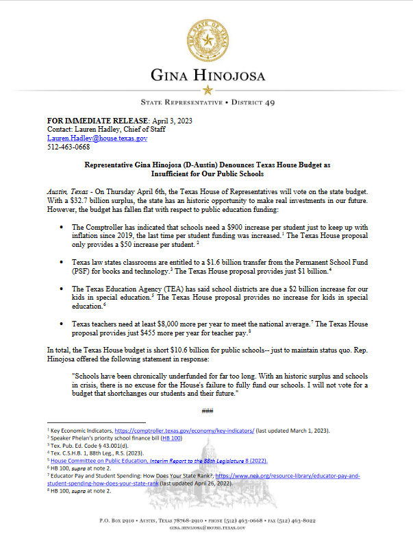 Top 5 This Week Texas Billionaire Brockman’s Estate Pays $750 Million to Settle Historic Tax Case Lifestyle RA Staff - December 26, 2025 How Are Texas High School Basketball Championships Decided? High School Basketball RA Staff - December 26, 2025 Texas Camps Install Flood Sirens After Deadly Camp Mystic Flood Public Safety RA Staff - December 25, 2025 Christmas Day 2025: What’s Open, What’s Closed, and Where You Can Still Go Lifestyle RA Staff - December 25, 2025 Texas Energy Costs Surge: Families Face Tough Decisions This Holiday Season Human Right's RA Staff - December 24, 2025 Related Posts Continue to the category JD Vance Takes Aim at Jasmine Crockett’s Senate Bid Politics Susie Wiles Offers Rare Look Inside Trump’s White House Politics Ken Paxton’s Divorce Files Could Soon Be Public Politics Houston City College Elects Renee Jefferson Patterson to District II Trustee Role Politics Houston Voters Choose New Leadership: Alejandra Salinas Wins At-Large Council Seat Politics Major Donors Walk Out as Alamo Leadership Clash Deepens Politics Representative Gina Hinojosa (D-Austin) Denounces Texas House Budget As Insufficient For Our Public Schools Politics Author: Press Release April 5, 2023 Less than 1 min.read FacebookTwitterEmail Download the full press release Previous articlePatrick Scolds Sen. Gutierrez for Mentioning Gun Violence in Debate About ‘Protecting Children’Next articleProtecting Kids Press Release LEAVE A REPLY Cancel reply Comment: Please enter your comment! Name:* Please enter your name here Email:* You have entered an incorrect email address! Please enter your email address here Website: Save my name, email, and website in this browser for the next time I comment. Δ