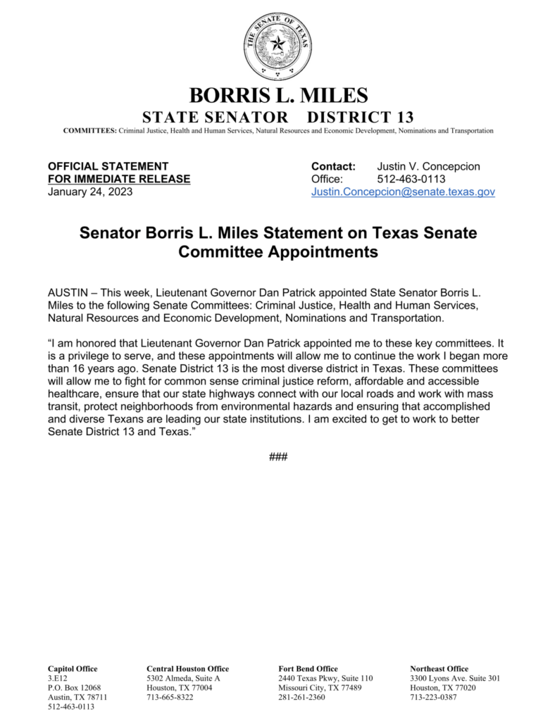 Top 5 This Week Texas Billionaire Brockman’s Estate Pays $750 Million to Settle Historic Tax Case Lifestyle RA Staff - December 26, 2025 How Are Texas High School Basketball Championships Decided? High School Basketball RA Staff - December 26, 2025 Texas Camps Install Flood Sirens After Deadly Camp Mystic Flood Public Safety RA Staff - December 25, 2025 Christmas Day 2025: What’s Open, What’s Closed, and Where You Can Still Go Lifestyle RA Staff - December 25, 2025 Texas Energy Costs Surge: Families Face Tough Decisions This Holiday Season Human Right's RA Staff - December 24, 2025 Related Posts Continue to the category JD Vance Takes Aim at Jasmine Crockett’s Senate Bid Politics Susie Wiles Offers Rare Look Inside Trump’s White House Politics Ken Paxton’s Divorce Files Could Soon Be Public Politics Houston City College Elects Renee Jefferson Patterson to District II Trustee Role Politics Houston Voters Choose New Leadership: Alejandra Salinas Wins At-Large Council Seat Politics Major Donors Walk Out as Alamo Leadership Clash Deepens Politics Senator Borris L. Miles Statement On Texas Senate Committee Appointments Politics Author: Press Release January 24, 2023 Less than 1 min.read FacebookTwitterEmail Download Full Press Release Previous articleState Representative Wu, The Texas Legislative Black Caucus, The Mexican American Legislative Caucus, The Texas House Democratic Caucus, And State Senate Democrats Join To Condemn Racist Republican Senate BillNext articleBudget Surplus Could Be Spent On Bigger School Allotments Press Release LEAVE A REPLY Cancel reply Comment: Please enter your comment! Name:* Please enter your name here Email:* You have entered an incorrect email address! Please enter your email address here Website: Save my name, email, and website in this browser for the next time I comment. Δ