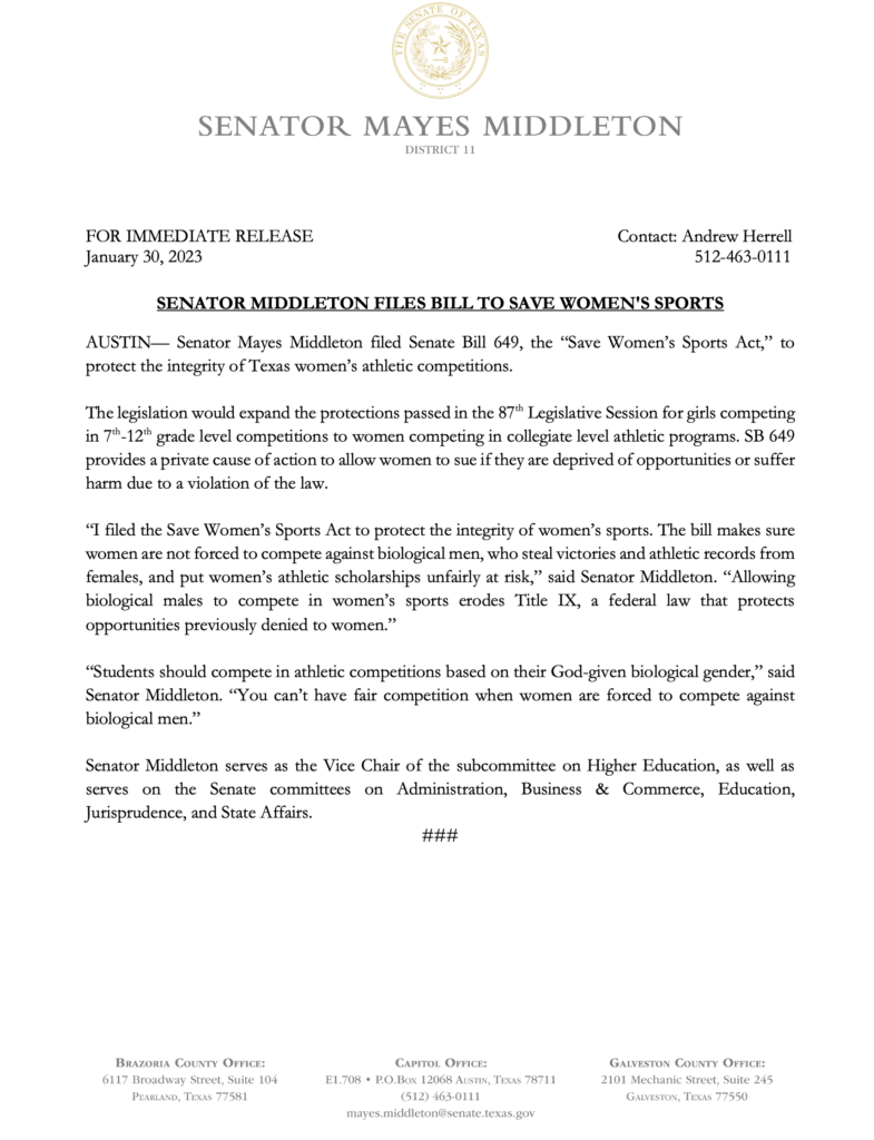 Top 5 This Week Texas Supreme Court Primary Shakeup Ends Before It Begins: Two Justices Now Unopposed Elections RA Staff - December 26, 2025 Texas Billionaire Brockman’s Estate Pays $750 Million to Settle Historic Tax Case Lifestyle RA Staff - December 26, 2025 How Are Texas High School Basketball Championships Decided? High School Basketball RA Staff - December 26, 2025 Texas Camps Install Flood Sirens After Deadly Camp Mystic Flood Public Safety RA Staff - December 25, 2025 Christmas Day 2025: What’s Open, What’s Closed, and Where You Can Still Go Lifestyle RA Staff - December 25, 2025 Related Posts Continue to the category JD Vance Takes Aim at Jasmine Crockett’s Senate Bid Politics Susie Wiles Offers Rare Look Inside Trump’s White House Politics Ken Paxton’s Divorce Files Could Soon Be Public Politics Houston City College Elects Renee Jefferson Patterson to District II Trustee Role Politics Houston Voters Choose New Leadership: Alejandra Salinas Wins At-Large Council Seat Politics Major Donors Walk Out as Alamo Leadership Clash Deepens Politics Senator Middleton Files Bill To Save Women’s Sports Politics Author: Press Release January 30, 2023 Less than 1 min.read FacebookTwitterEmail Download Full Press Release Previous articleSenator Joan Huffman Files Senate Bill 645 To Combat FentanylNext articleRep. Harrison Leads Lawmakers In Urging All Schools To Leave TASB Press Release LEAVE A REPLY Cancel reply Comment: Please enter your comment! Name:* Please enter your name here Email:* You have entered an incorrect email address! Please enter your email address here Website: Save my name, email, and website in this browser for the next time I comment. Δ