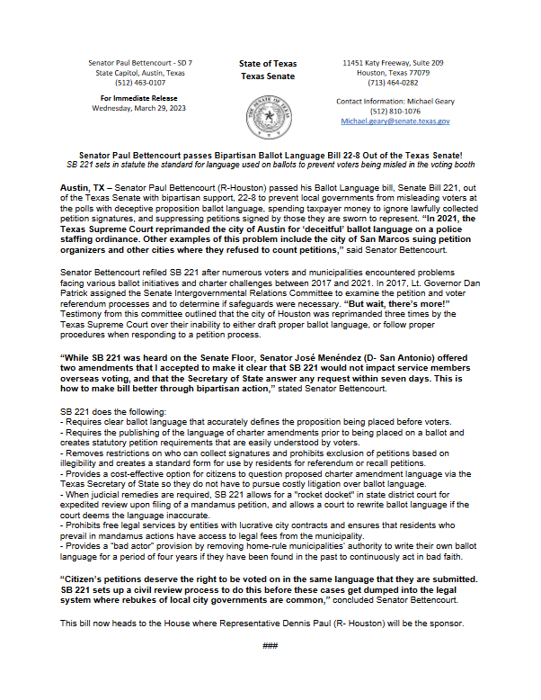 Top 5 This Week Texas Supreme Court Primary Shakeup Ends Before It Begins: Two Justices Now Unopposed Elections RA Staff - December 26, 2025 Texas Billionaire Brockman’s Estate Pays $750 Million to Settle Historic Tax Case Lifestyle RA Staff - December 26, 2025 How Are Texas High School Basketball Championships Decided? High School Basketball RA Staff - December 26, 2025 Texas Camps Install Flood Sirens After Deadly Camp Mystic Flood Public Safety RA Staff - December 25, 2025 Christmas Day 2025: What’s Open, What’s Closed, and Where You Can Still Go Lifestyle RA Staff - December 25, 2025 Related Posts Continue to the category JD Vance Takes Aim at Jasmine Crockett’s Senate Bid Politics Susie Wiles Offers Rare Look Inside Trump’s White House Politics Ken Paxton’s Divorce Files Could Soon Be Public Politics Houston City College Elects Renee Jefferson Patterson to District II Trustee Role Politics Houston Voters Choose New Leadership: Alejandra Salinas Wins At-Large Council Seat Politics Major Donors Walk Out as Alamo Leadership Clash Deepens Politics Senator Paul Bettencourt Passes Bipartisan Ballot Language Bill 22-8 Out Of The Texas Senate Politics Author: Press Release March 29, 2023 Less than 1 min.read FacebookTwitterEmail Download the full press release Previous articleVouchers, A New Brand Of Indoctrination In TexasNext articleCruz Introduces Bill To Hold Argentinian Officials Accountable for Corruption Press Release LEAVE A REPLY Cancel reply Comment: Please enter your comment! Name:* Please enter your name here Email:* You have entered an incorrect email address! Please enter your email address here Website: Save my name, email, and website in this browser for the next time I comment. Δ