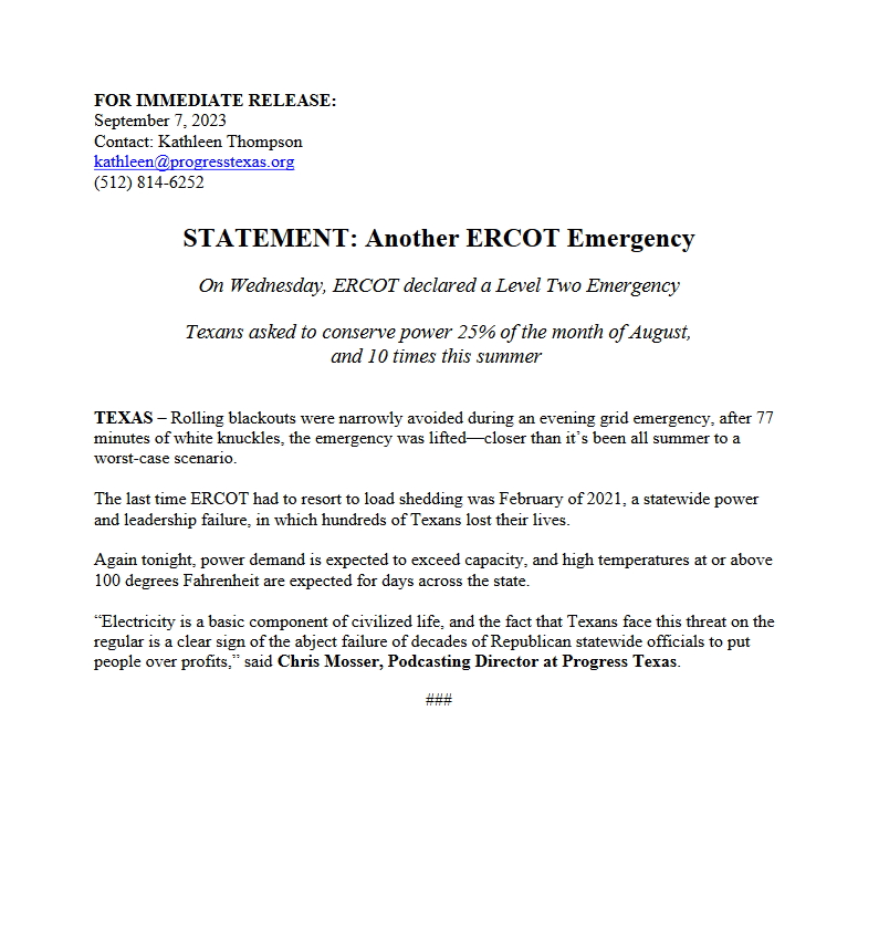 Top 5 This Week Texas Billionaire Brockman’s Estate Pays $750 Million to Settle Historic Tax Case Lifestyle RA Staff - December 26, 2025 How Are Texas High School Basketball Championships Decided? High School Basketball RA Staff - December 26, 2025 Texas Camps Install Flood Sirens After Deadly Camp Mystic Flood Public Safety RA Staff - December 25, 2025 Christmas Day 2025: What’s Open, What’s Closed, and Where You Can Still Go Lifestyle RA Staff - December 25, 2025 Texas Energy Costs Surge: Families Face Tough Decisions This Holiday Season Human Right's RA Staff - December 24, 2025 Related Posts Continue to the category JD Vance Takes Aim at Jasmine Crockett’s Senate Bid Politics Susie Wiles Offers Rare Look Inside Trump’s White House Politics Ken Paxton’s Divorce Files Could Soon Be Public Politics Houston City College Elects Renee Jefferson Patterson to District II Trustee Role Politics Houston Voters Choose New Leadership: Alejandra Salinas Wins At-Large Council Seat Politics Major Donors Walk Out as Alamo Leadership Clash Deepens Politics STATEMENT: Another ERCOT Emergency Politics Author: Press Release September 7, 2023 Less than 1 min.read FacebookTwitterEmail Download the full press release Previous articleBorder BuoysNext article86.3 Percent Of Convicted Fentanyl Traffickers Legally Cross The Border Press Release LEAVE A REPLY Cancel reply Comment: Please enter your comment! Name:* Please enter your name here Email:* You have entered an incorrect email address! Please enter your email address here Website: Save my name, email, and website in this browser for the next time I comment. Δ