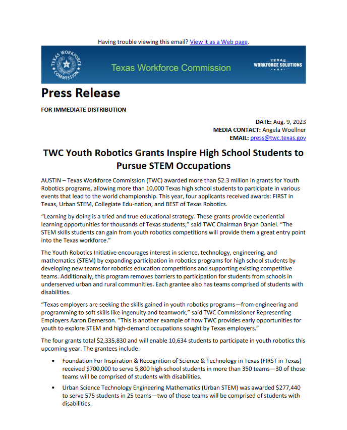 Top 5 This Week Texas Supreme Court Primary Shakeup Ends Before It Begins: Two Justices Now Unopposed Elections RA Staff - December 26, 2025 Texas Billionaire Brockman’s Estate Pays $750 Million to Settle Historic Tax Case Lifestyle RA Staff - December 26, 2025 How Are Texas High School Basketball Championships Decided? High School Basketball RA Staff - December 26, 2025 Texas Camps Install Flood Sirens After Deadly Camp Mystic Flood Public Safety RA Staff - December 25, 2025 Christmas Day 2025: What’s Open, What’s Closed, and Where You Can Still Go Lifestyle RA Staff - December 25, 2025 Related Posts Continue to the category JD Vance Takes Aim at Jasmine Crockett’s Senate Bid Politics Susie Wiles Offers Rare Look Inside Trump’s White House Politics Ken Paxton’s Divorce Files Could Soon Be Public Politics Houston City College Elects Renee Jefferson Patterson to District II Trustee Role Politics Houston Voters Choose New Leadership: Alejandra Salinas Wins At-Large Council Seat Politics Major Donors Walk Out as Alamo Leadership Clash Deepens Politics TWC Youth Robotics Grants Inspire High School Students To Pursue STEM Occupations Politics Author: Press Release August 9, 2023 Less than 1 min.read FacebookTwitterEmail Download the full press release Previous articleRon DeSantisNext articleBack To School Blues: Abbott’s Funding Failures Cast Shadow Over New School Year Press Release LEAVE A REPLY Cancel reply Comment: Please enter your comment! Name:* Please enter your name here Email:* You have entered an incorrect email address! Please enter your email address here Website: Save my name, email, and website in this browser for the next time I comment. Δ
