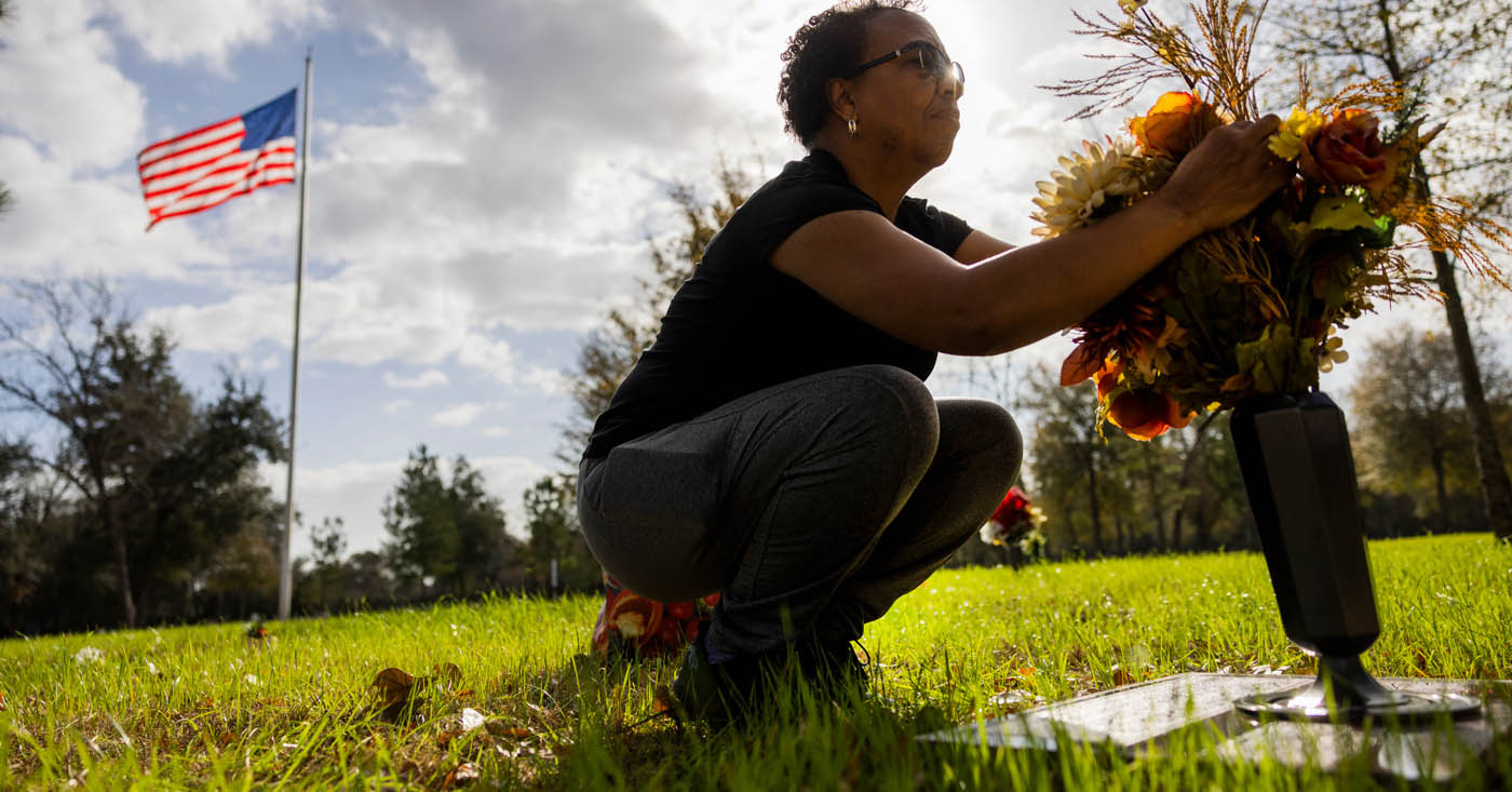 Rowena Ward replaces flowers on her son Rory Ward’s grave at Klein Memorial Park Cemetery, Saturday, Jan. 7, 2023, in Houston. Rory was killed in Harris County Jail in 2021 by fellow inmates. He was in jail despite having a documented history of mental illness. Marie D. De Jesús/Houston Landing