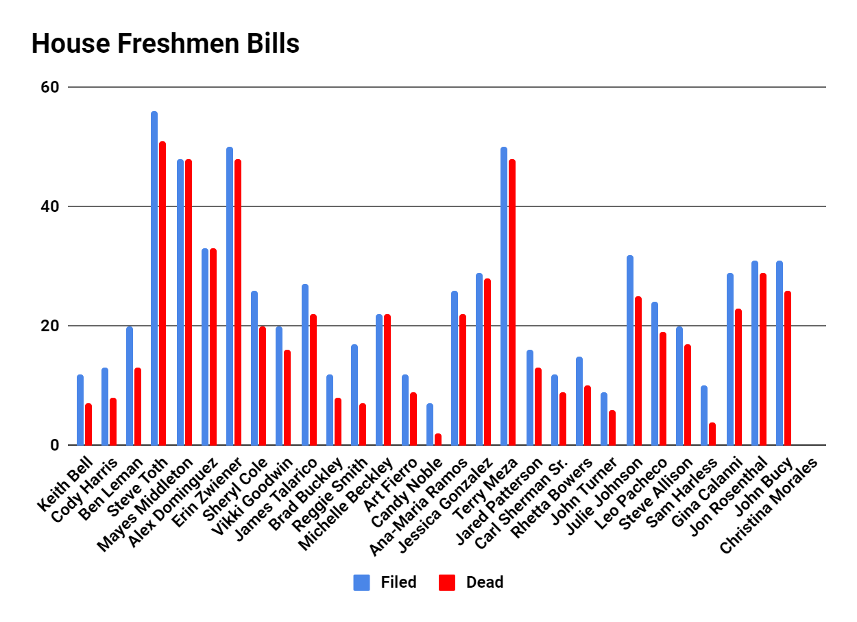 On May 10th, the House had a deadline to move remaining bills from the House and to the Senate. After this date, all other consent house bills are dead. Out of the many bills filed, how many did the House freshmen manage to keep alive and move into the Senate?