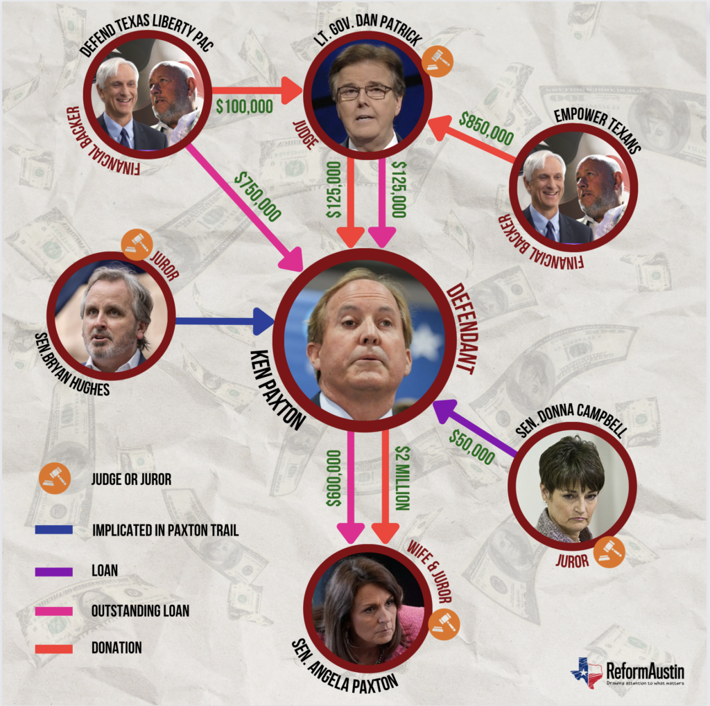 The financial ties between Paxton and Patrick are particularly significant, given Patrick’s role in presiding over the trial. In addition to the direct loan, Patrick and Paxton share financial backers, Defend Texas Liberty PAC, a conservative group financed by oil billionaires Tim Dunn and Ferris Wilks.