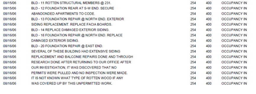 Other citations include unpermitted siding replacements that inspectors said “It is not known what type of rotten wood if any was covered up by this unpermitted work.”